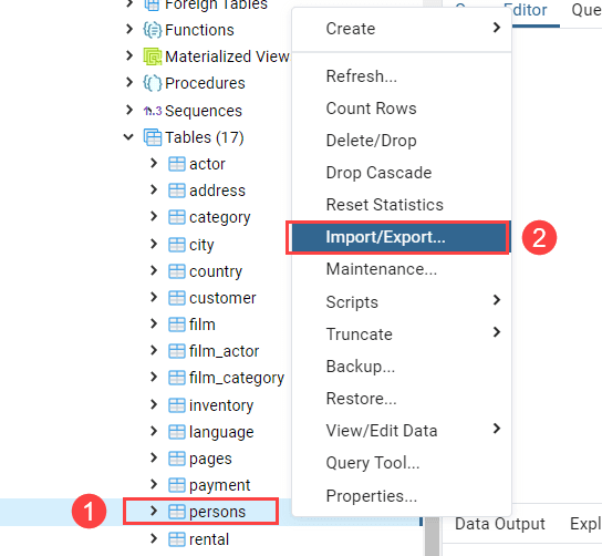 RESTART IDENTITY;First, right-click the persons table and select the Import/Export… menu item: